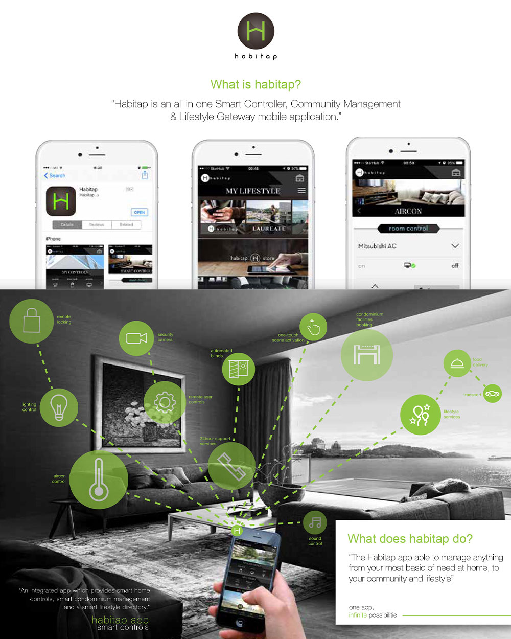 Habitap is Asia’s first fully integrated smart living management system that seamlessly combines smart controls, community management and lifestyle offerings – three key features for modern day smart living – into a single platform. Harnessing the technology behind Internet of Things (IoT), Habitap aims to create better living, greater convenience and efficiency for commercial, residential and various spaces.